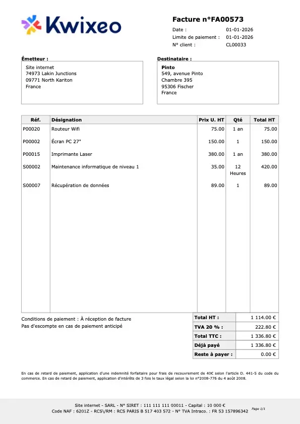 Voyons maintenant un exemple concret de facture, conforme aux obligations légales et adaptée à une petite entreprise.